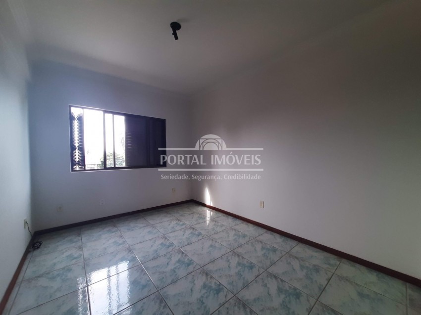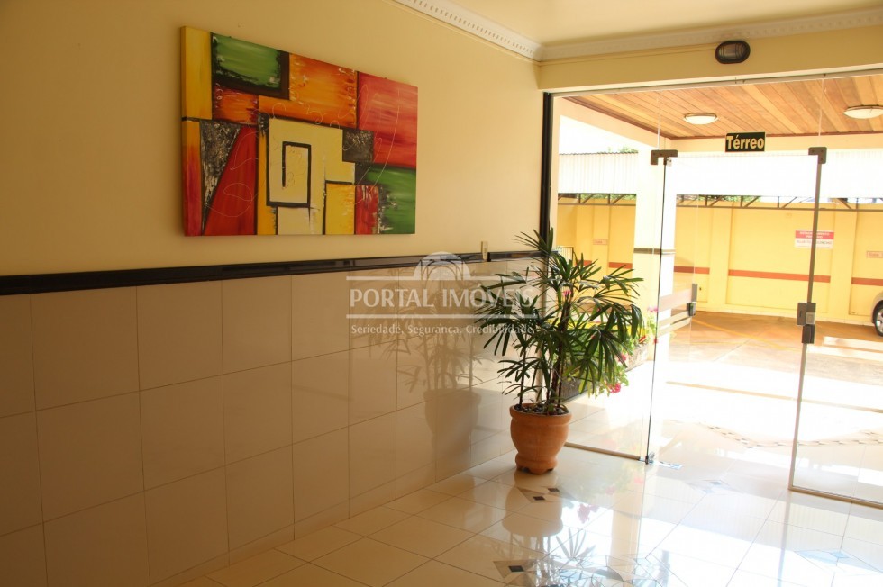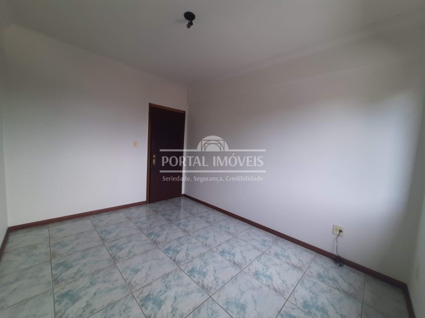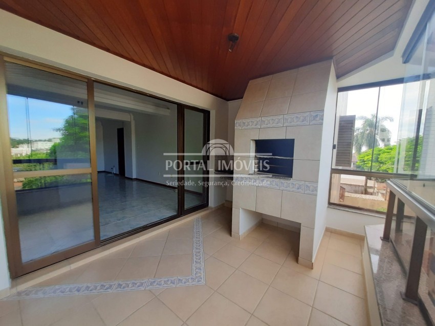 Apartamento de frente com três dormitórios sendo um suíte, ampla sala de estar com sacada fechada e churrasqueira, cozinha, área de serviço, banheiro e uma vaga de garagem.