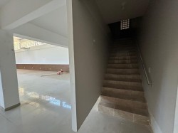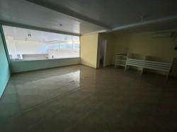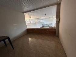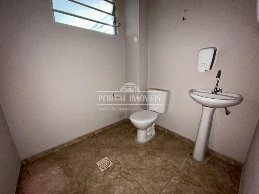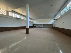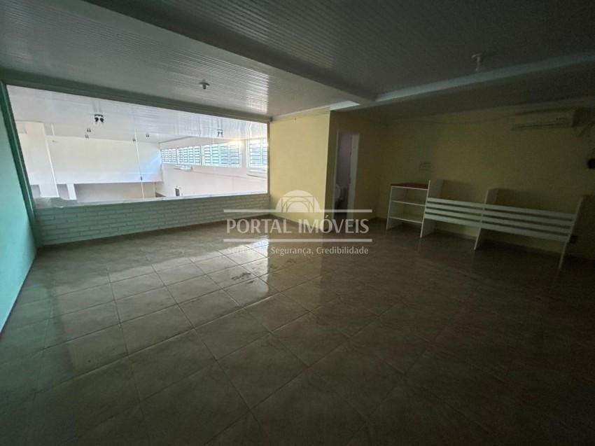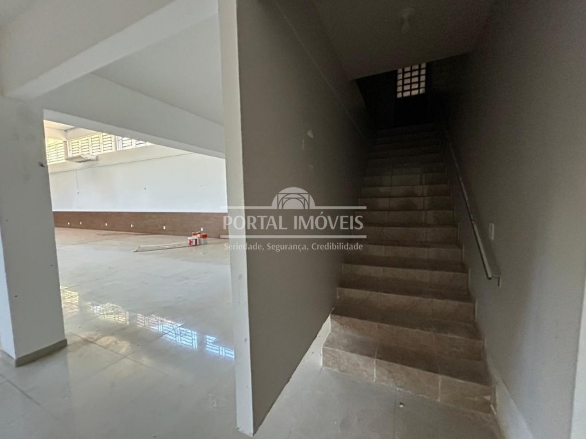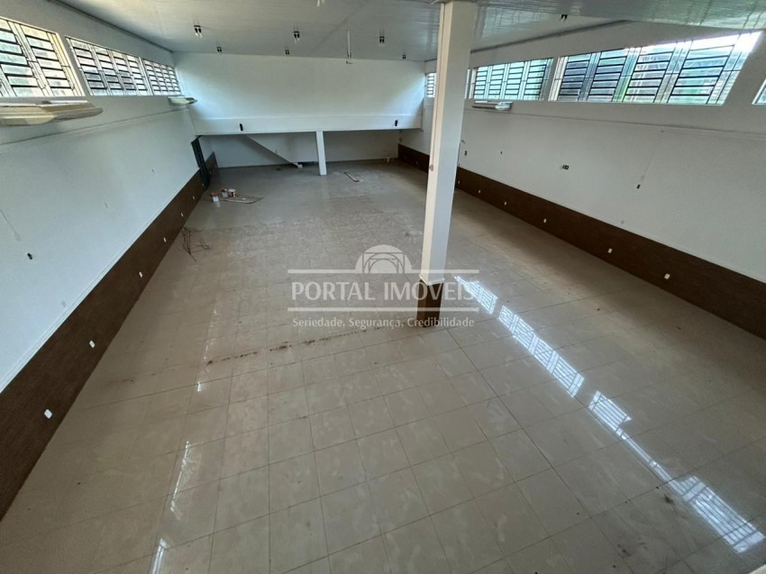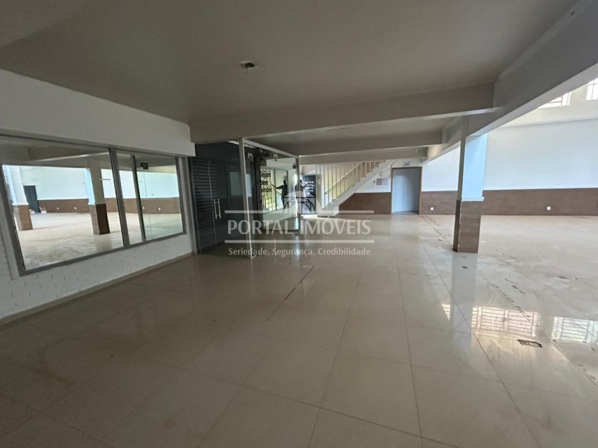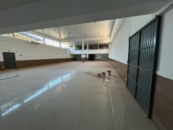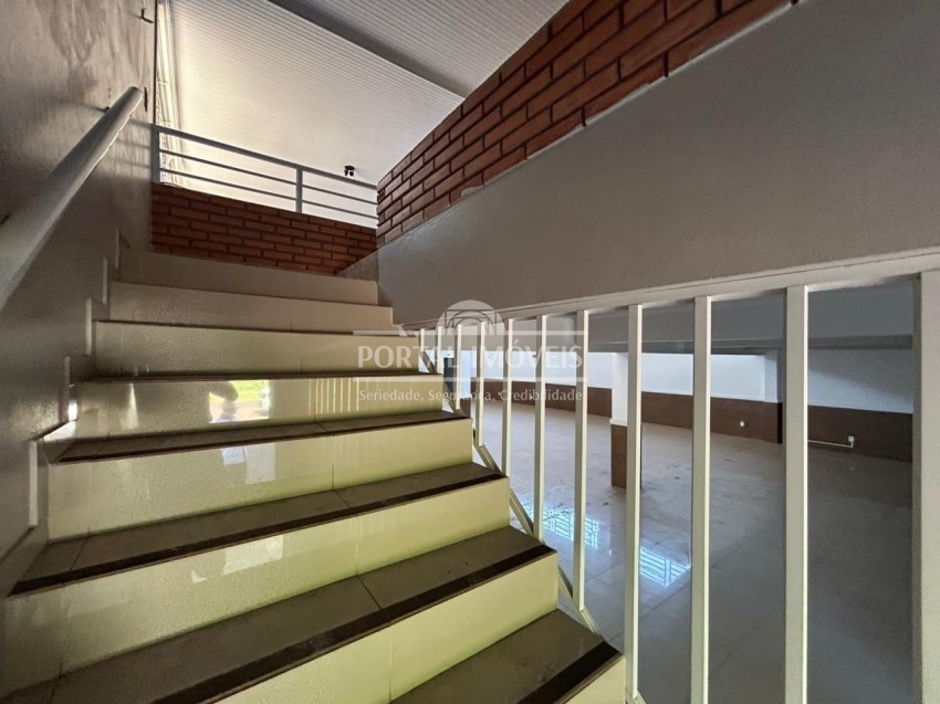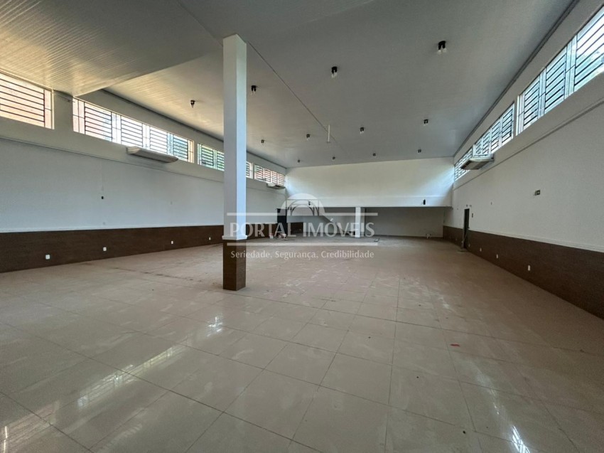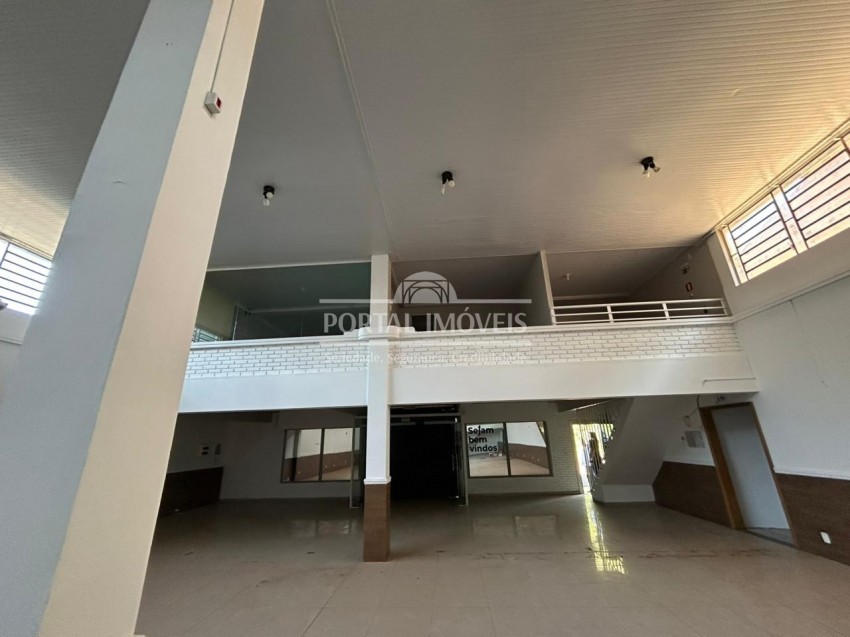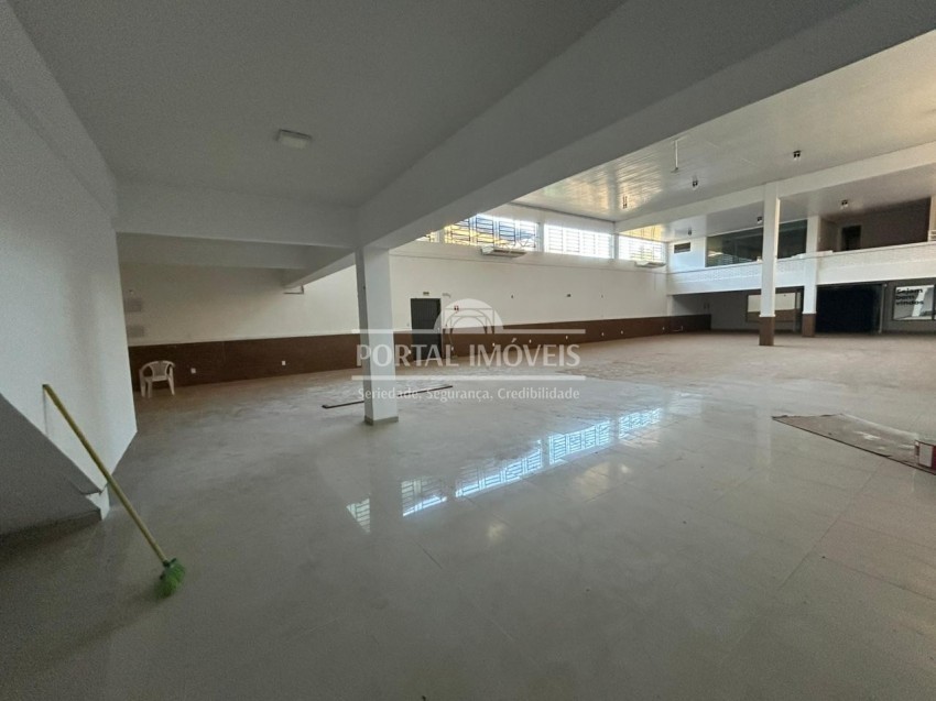 Ampla sala comercial com 650m² (com climatizadores), quatro banheiros, cozinha e dois mezaninos.