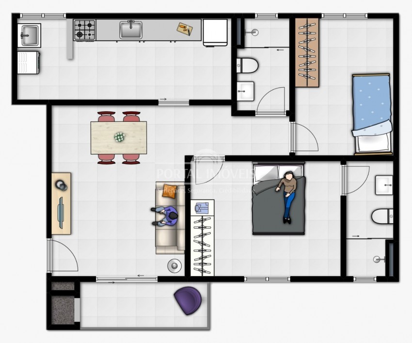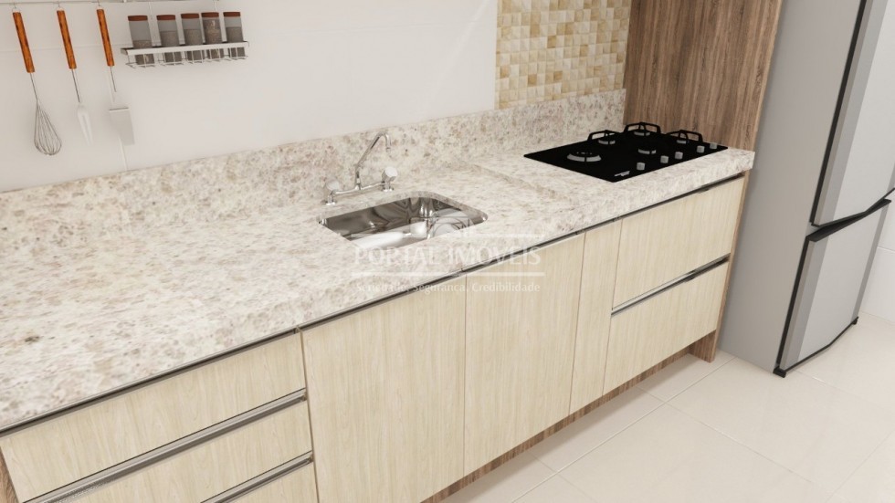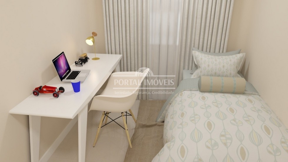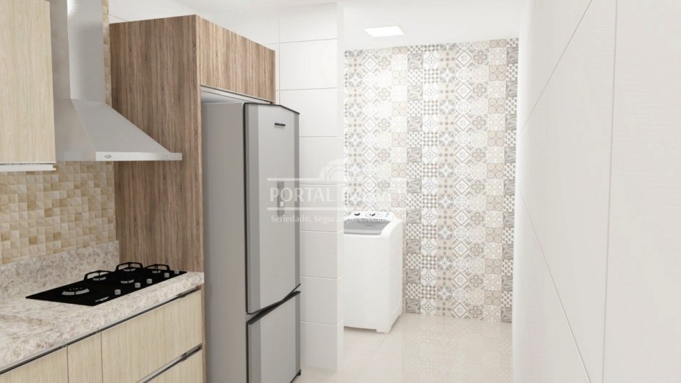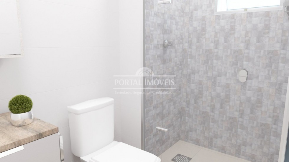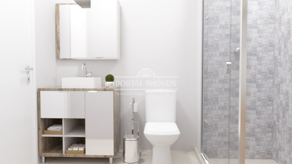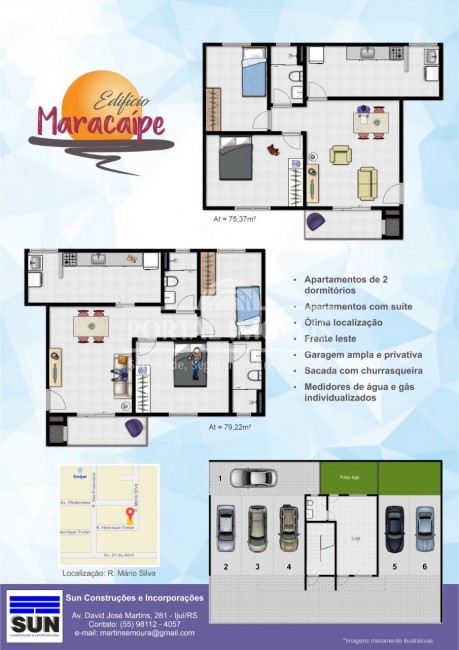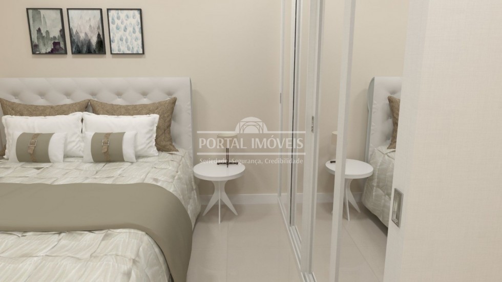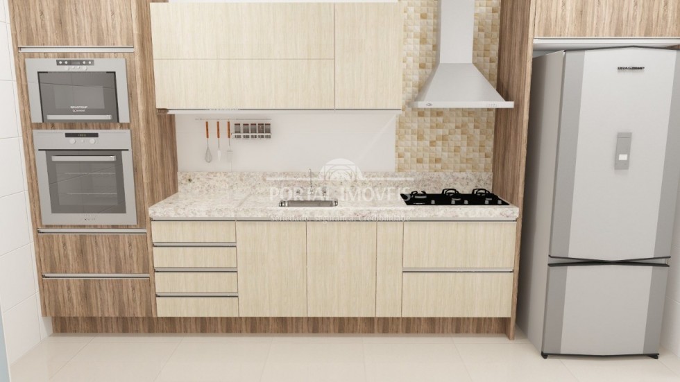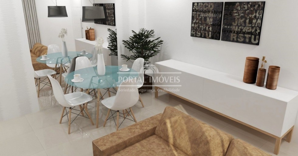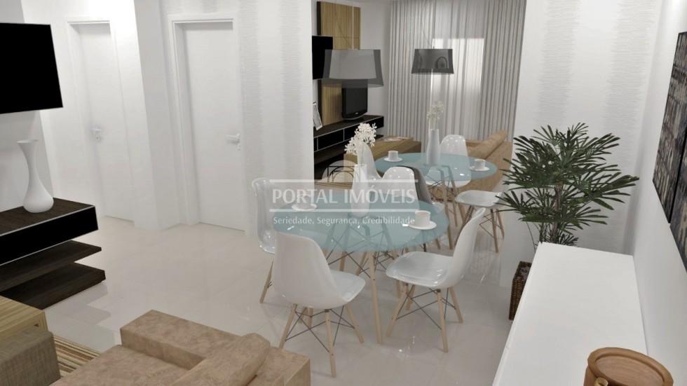 Apartamentos de dois dormitórios, sendo uma suíte, sala de estar e jantar conjugadas, cozinha, área de serviço, banheiro, sacada com churrasqueira e duas vagas de garagem.