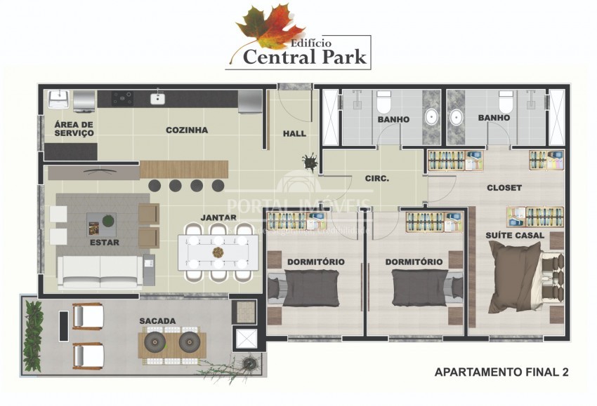 Com uma área privativa de 120m², o apartamento conta com 3 dormitórios, sendo uma suíte com closet, sala de jantar e estar, cozinha, área de serviço, ampla sacada com churrasqueira e banheiro privativo e social, além de duas vagas de garagem.