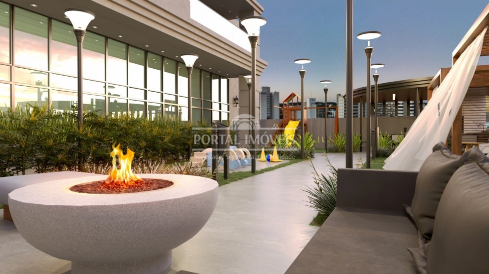 ⇒ Espaço externo com playground, pet place, fire place, quiosque com churrasqueira, ambiente para descanso.
