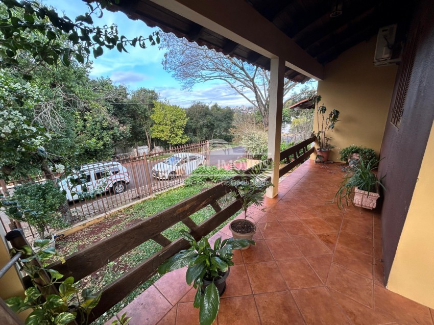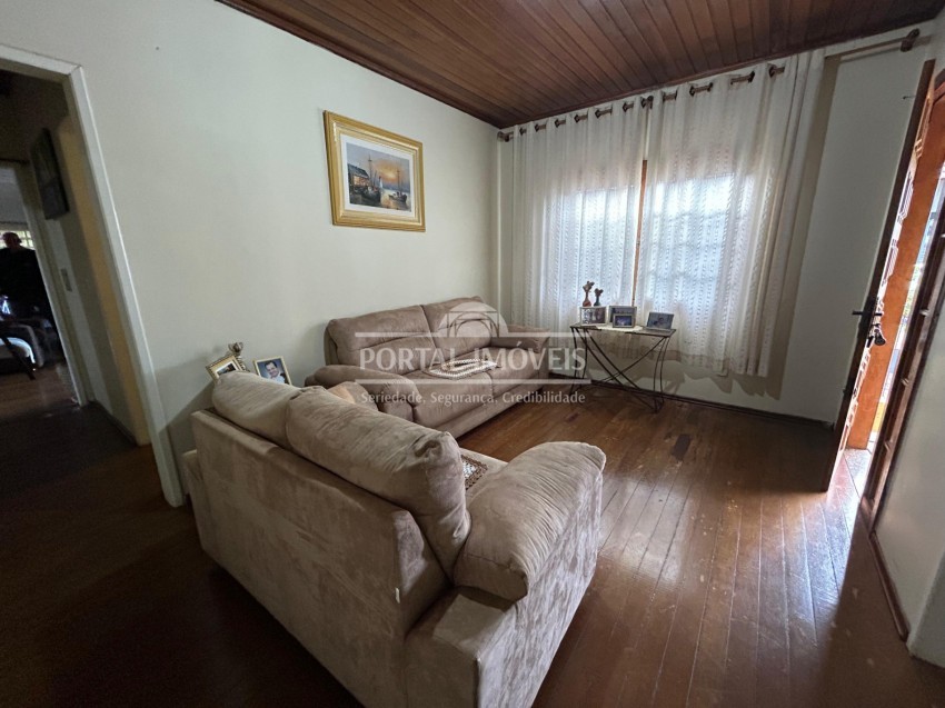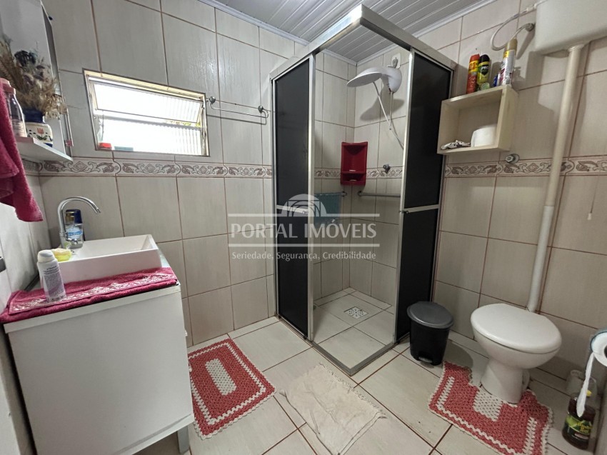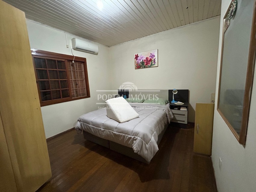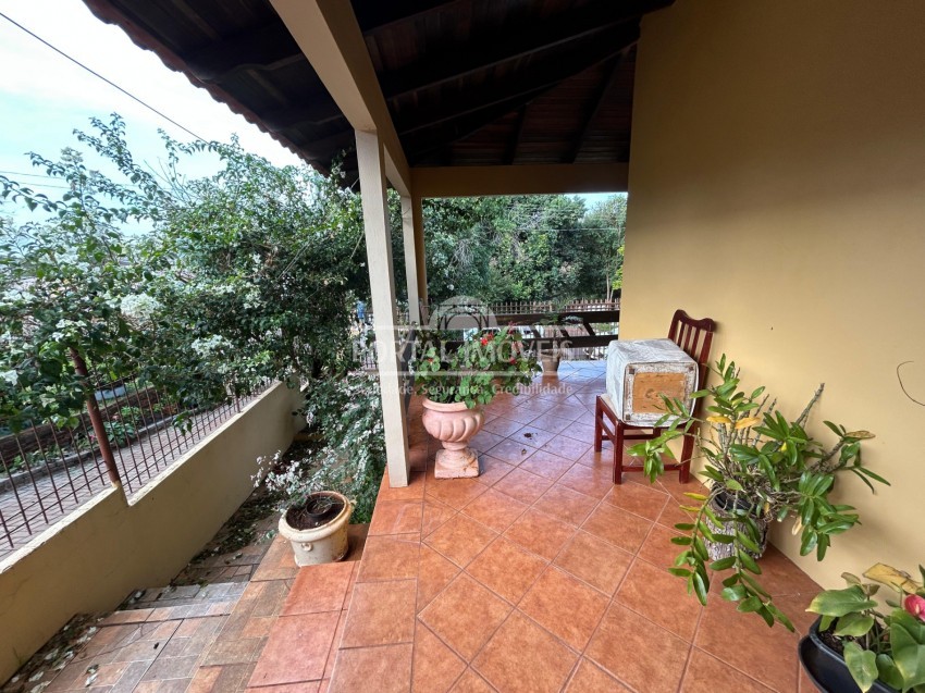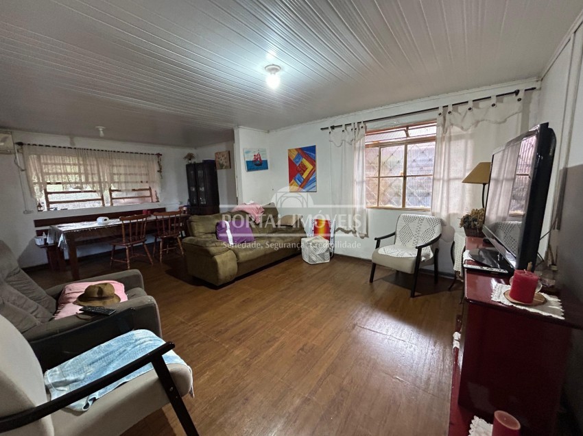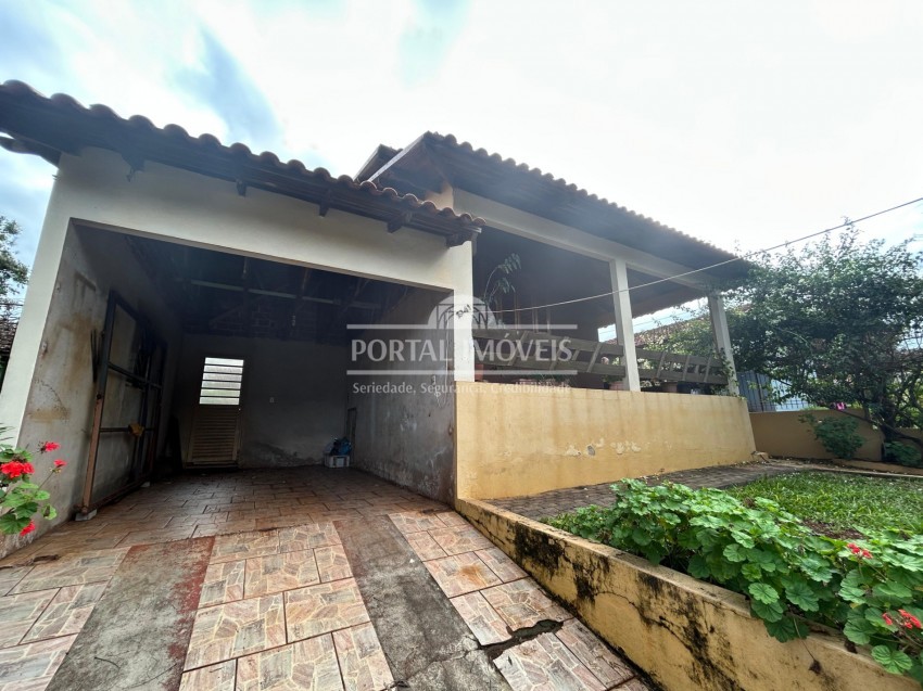 Casa de Alvenaria com quatro dormitórios, sala de estar/jantar, banheiro social, duas cozinhas, área de serviço, área de fundos com churrasqueira. Garagem para um carro