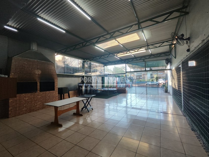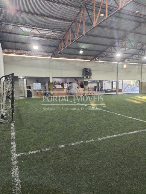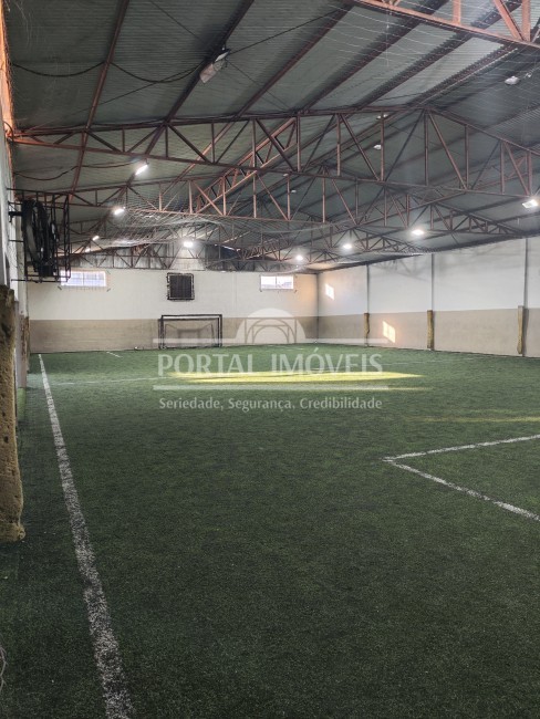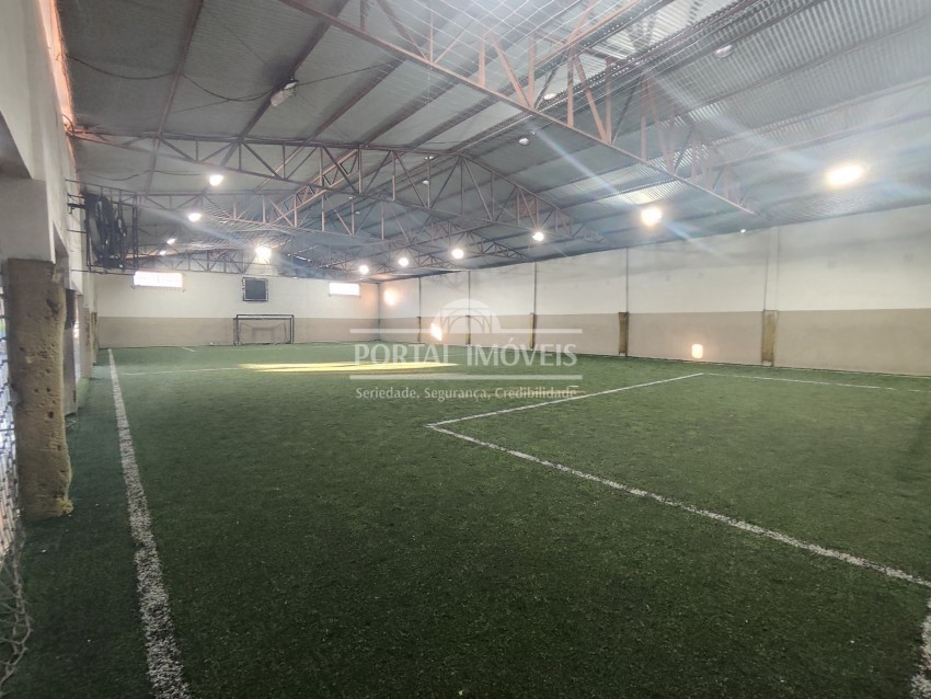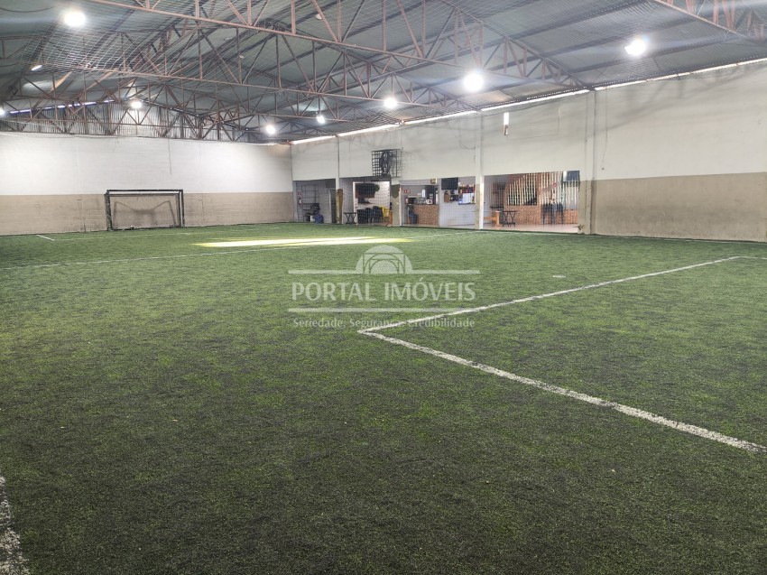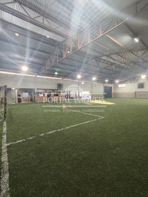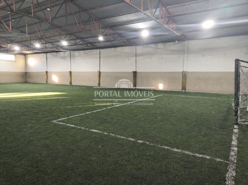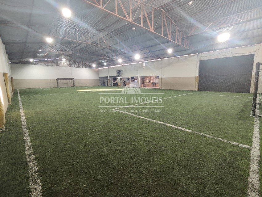 Quadra esportiva com espaço de lazer com duas churrasqueiras, duas pias, dois banheiros, estacionamento.